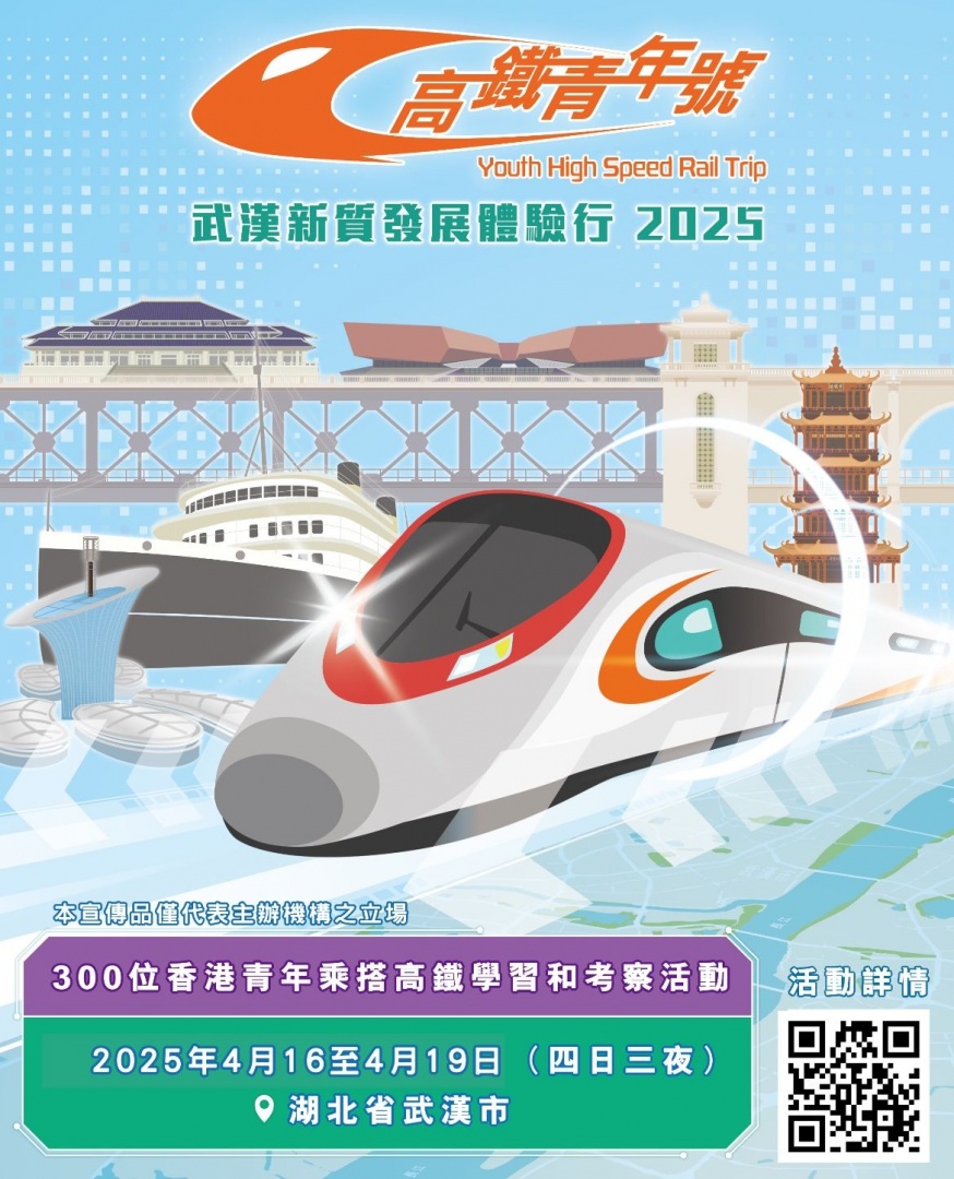 2025「高鐵青年號─武漢新質發展體驗行」 日期: 2025 年 4月16日至19日 (4日3夜,星期三至六) 地點: 中國湖北省武漢市 名額: 300 名 (名額先到先得,額滿即止,大會有最終決定權