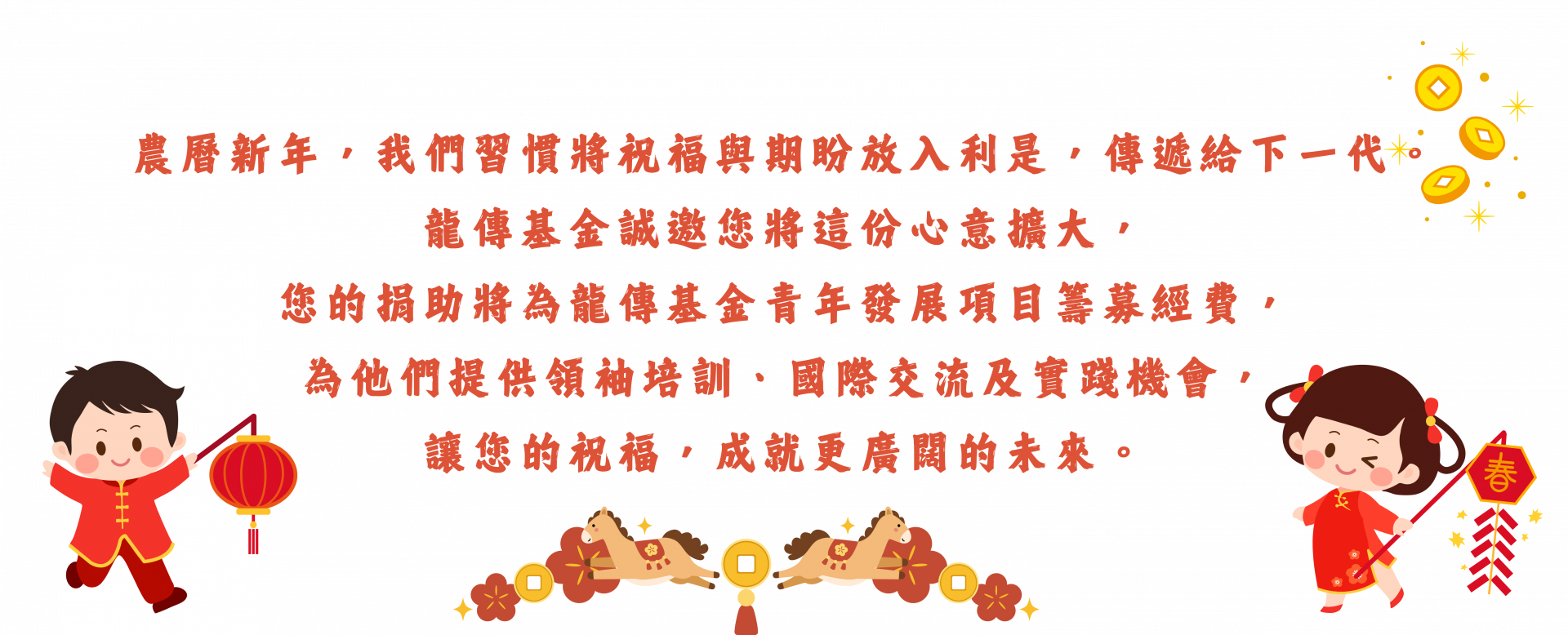 「龍傳基金」此項對華裔青年作出長遠承擔的基金,極需要社會各界的參與。您的熱心支持和贊助,將會為推動基金,以及培育廿一世紀的優秀華裔青年領袖人才,作出寶貴貢獻。